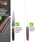 The ENNO trimming knife is designed for precise and detailed cutting. Its extra-pointy, sharp blade made from high-quality Solingen steel makes trimming meat and poultry or decorating fruits and vegetables effortless. The ergonomic walnut handle sits comfortably in your hand, giving perfect control for professional results with minimal effort.