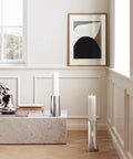 With its bold graphic quality and finely balanced proportions, this large stainless steel vase appears almost to float, exemplifying the purity of minimalist Scandinavian design. The mirror polished surface captures and reflects light, echoing the colors and forms of any floral arrangement placed within. Its sculptural simplicity ensures a strong visual presence even when displayed empty on a table or shelf.